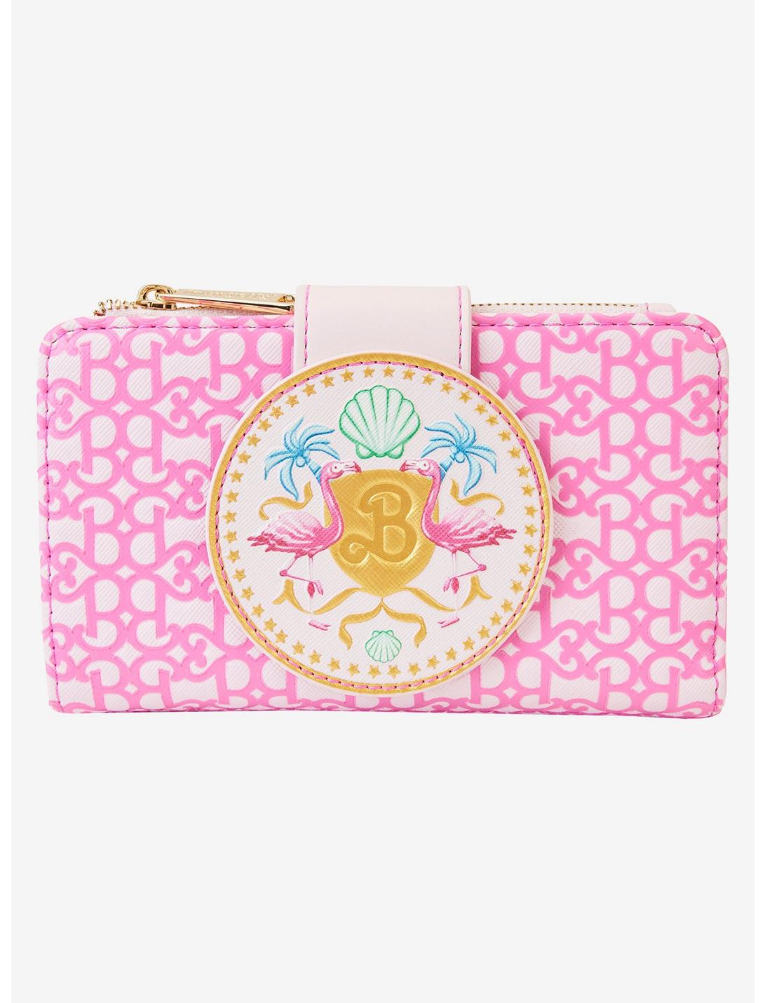 Travel to Barbieland in style with this Barbie the Movie-inspired wallet! Featuring an allover debossed print of the Barbie logo, the snap closure of this wallet includes a flamingo and star badge design. The interior of the wallet opens up to reveal seven card slots, a clear ID sleeve, bills compartment, and a zippered pouch, perfect for adding some pretty pink style to your accessory collection.