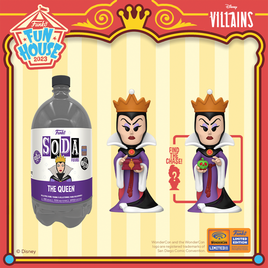 WonderCon 2023 Reveals: Vinyl SODA 3-Liter: Disney Villains – Evil Queen with CHASE. Funko has taken the beloved SODA product and enlarged it to a 3-Liter size! Product includes a collectible 3-Liter bottle, a 7" figure, and collectible disc!