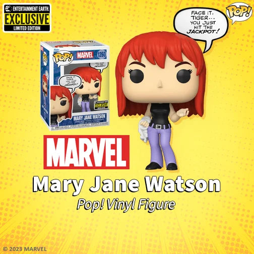 Entertainment Earth Exclusive! "Face it, Tiger you just hit the jackpot!" Mary Jane Watson is stepping off the comic book pages and into your Marvel collection as a dynamic Funko Pop! Featuring her classic comic style, Spidey's red-headed love even comes with a unique speech bubble featuring her iconic line. This limited edition Spider-Man Mary Jane Watson Funko Pop! Vinyl Figure #1260 - Entertainment Earth Exclusive measures approximately 3 3/4-inches tall and comes packaged in a window display box. Add Mary Jane to your Spider-Mancollection while supplies last!